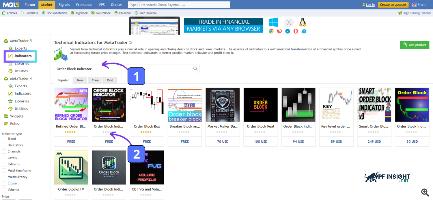 In MetaTrader 5, you can download indicators directly without accessing an external browser. The Market feature is built into the platform, making it easy for users to find, download and install indicators quickly.