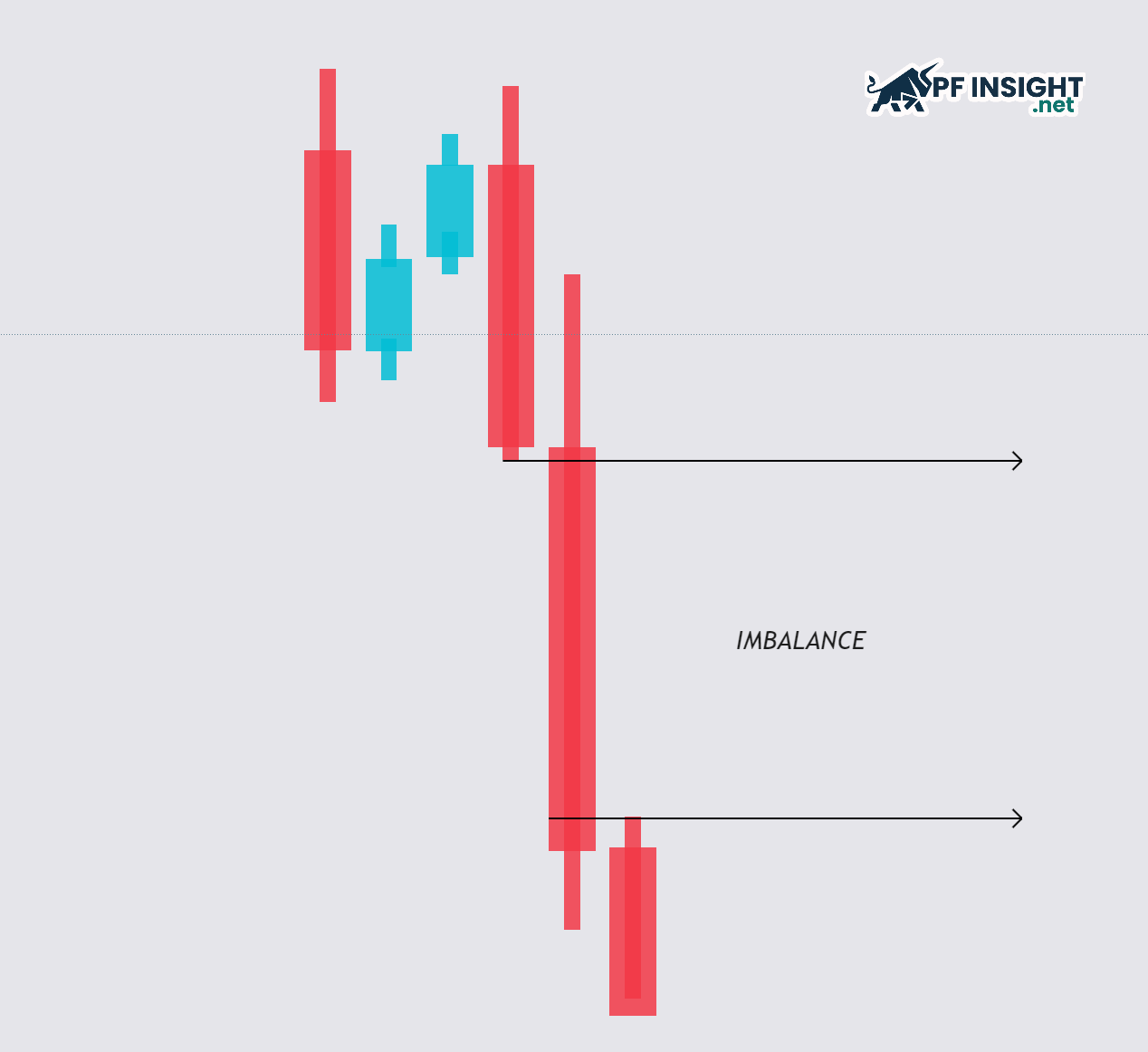 - Bearish Imbalance: A bearish imbalance occurs when selling pressure clearly dominates, pushing prices down sharply and creating areas where buying power is insufficient to respond in time. This indicates an imbalance leaning towards the selling side of the market.