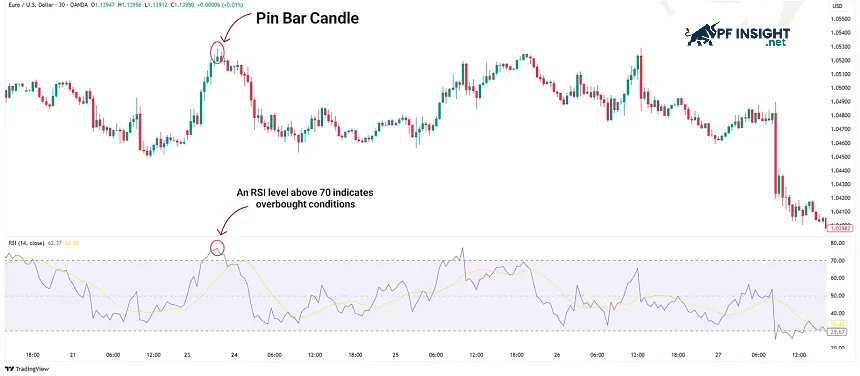 On the 30-minute chart of the EUR/USD pair, when a bearish pin bar candle forms at a key resistance zone, traders can begin planning a trade. The candle, with its long upper wick and small body, indicates strong selling pressure at the high price level. Simultaneously, the RSI exceeding 70 confirms the market is in an overbought state, increasing the probability of a bearish reversal.