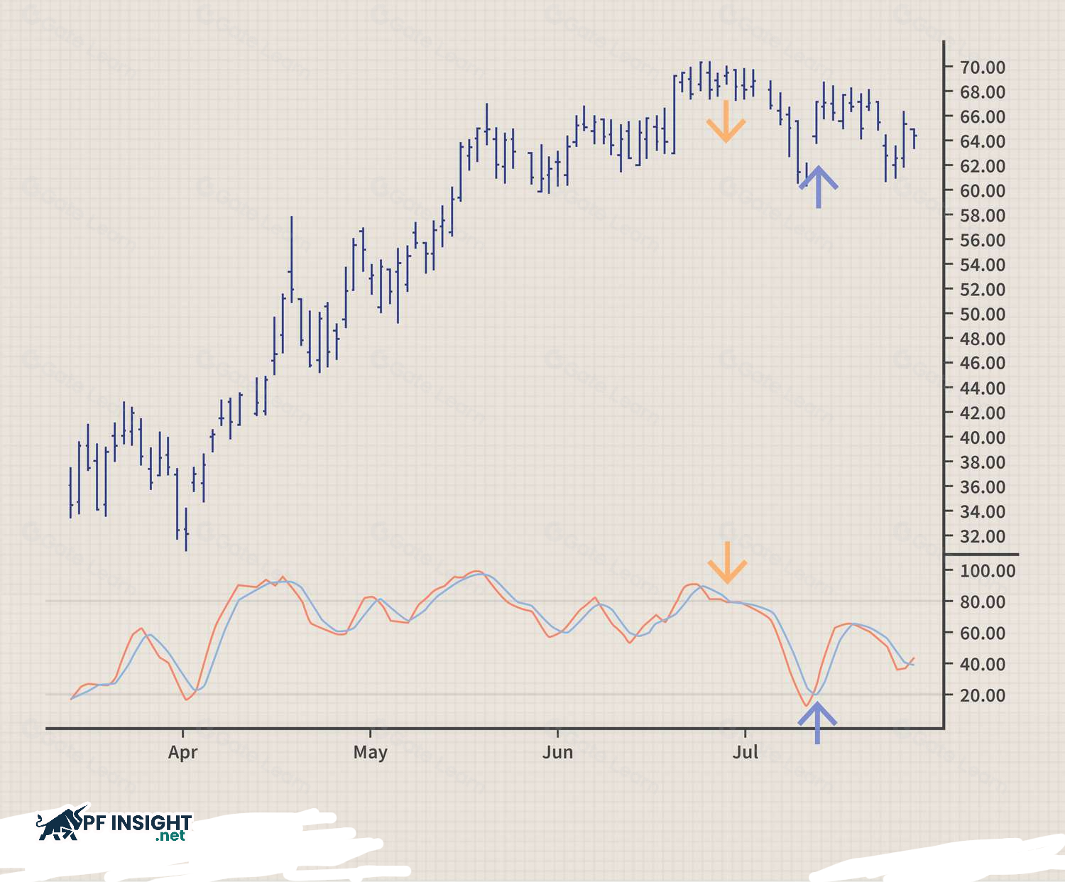 The Stochastic Oscillator focuses on two key levels, 80 and 20, to identify overbought and oversold zones. Additionally, the crossover signal between the %K and %D lines provides further basis for traders to find suitable entry points, especially when it appears near key price levels.