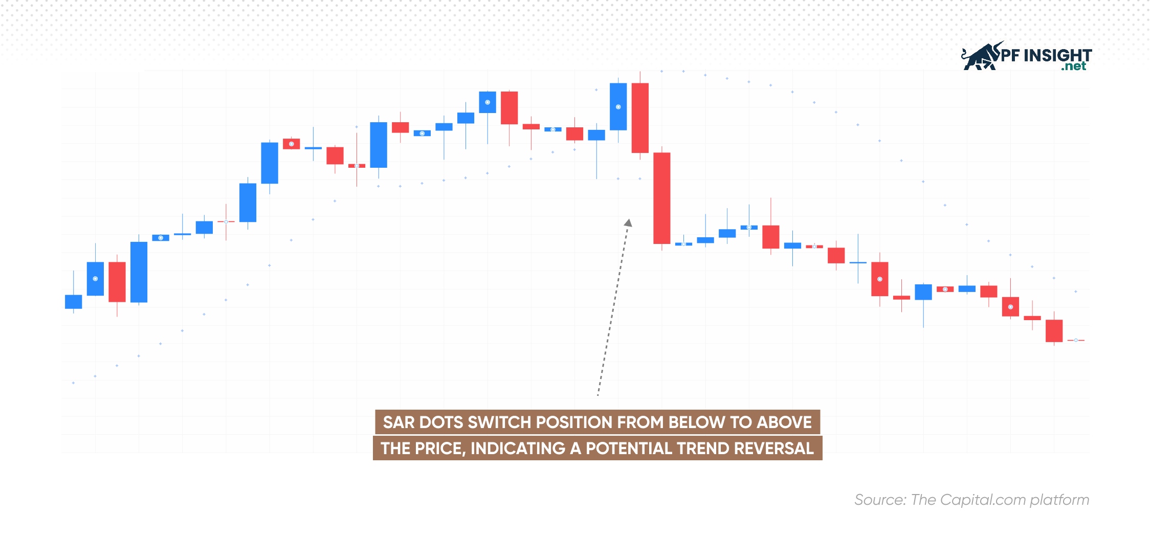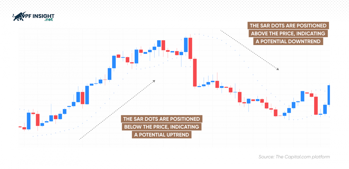 For example, when the Parabolic SAR moves from above the price line to below the price line, the market may be shifting from a downtrend to an uptrend. Conversely, if the SAR dots move from below the price line to above the price line, this is generally seen as a signal that the uptrend may be ending and reversing to a downtrend.