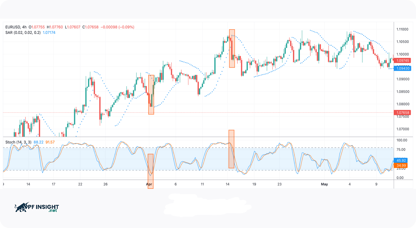 The Stochastic Oscillator helps identify when the price falls into overbought or oversold zones, often signaling a potential short-term reversal. Using this indicator along with the Parabolic SAR allows traders to filter out noise and more accurately confirm buy or sell entry points.