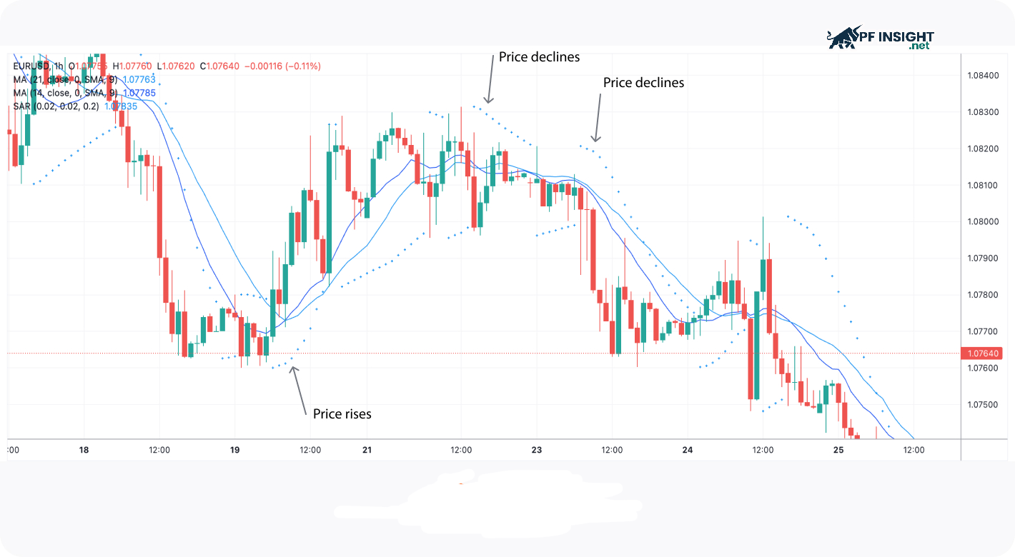 - Downtrend: The SAR dot is above the price, indicating that downward momentum is dominant.