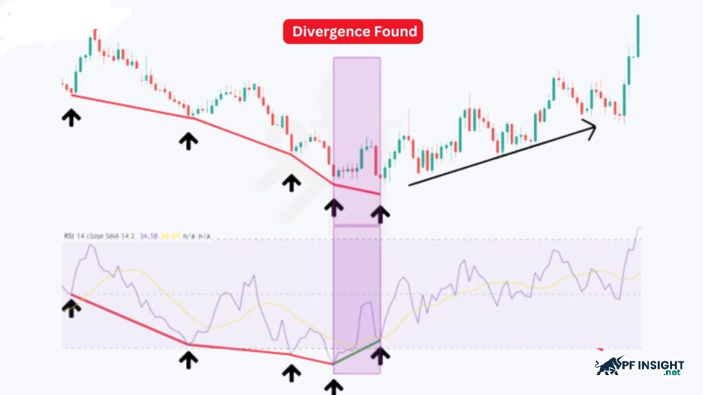 Next, look for divergence on the chart. When the downward price trend line creates lower lows but the upward RSI trend line creates higher lows, this is bullish divergence. This mismatch signals decreasing selling pressure and the possibility of a price reversal to an upward trend.