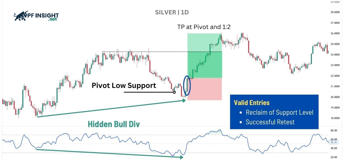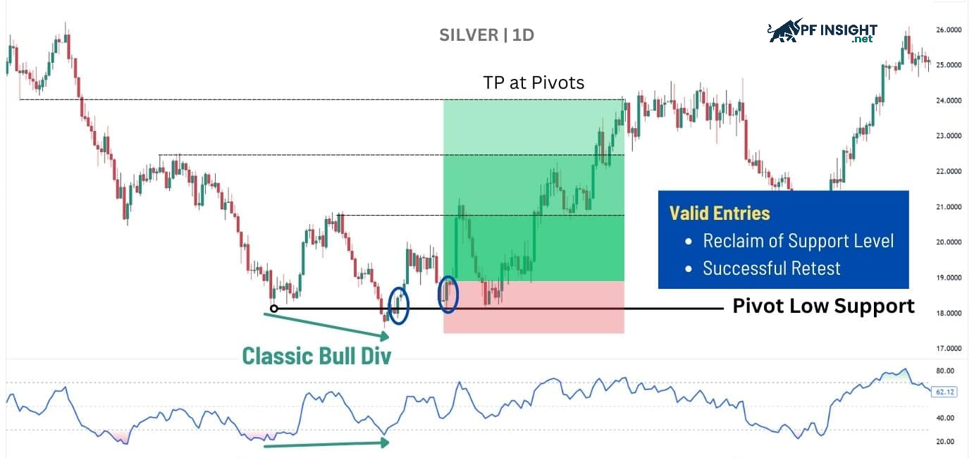 - Entry: Enter the trade when price rebounds from the pivot low and shows a strong closing candle confirming buying pressure.