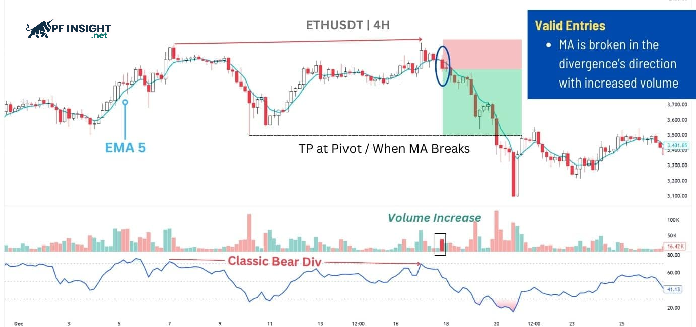 - Entry: Enter the trade after price breaks above the EMA 5 with a strong increase in trading volume, in the direction of the divergence.