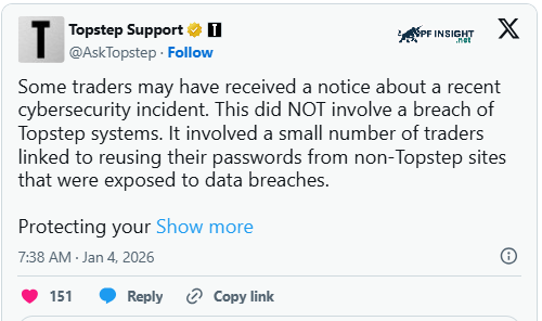 Topstep asserted on X that their system was not compromised. According to the company, the incident stemmed from a small group of traders using the same password as other websites that had previously experienced data leaks. They emphasized that this was a personal security error due to the habit of reusing login information, not a vulnerability on the platform’s part.